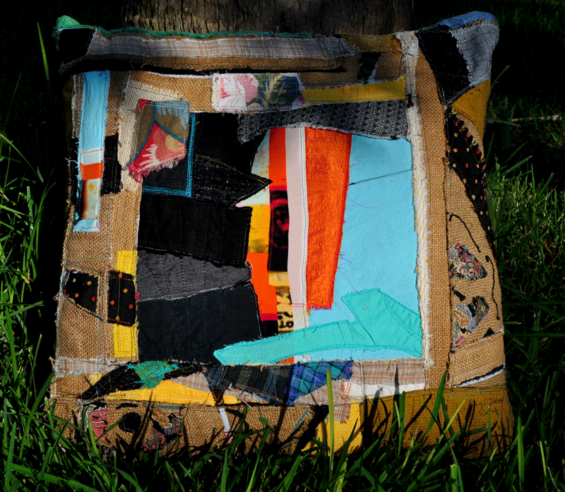 Edge-strip pillow complete. The lines of flickering colors and textures makes me think of music-- an